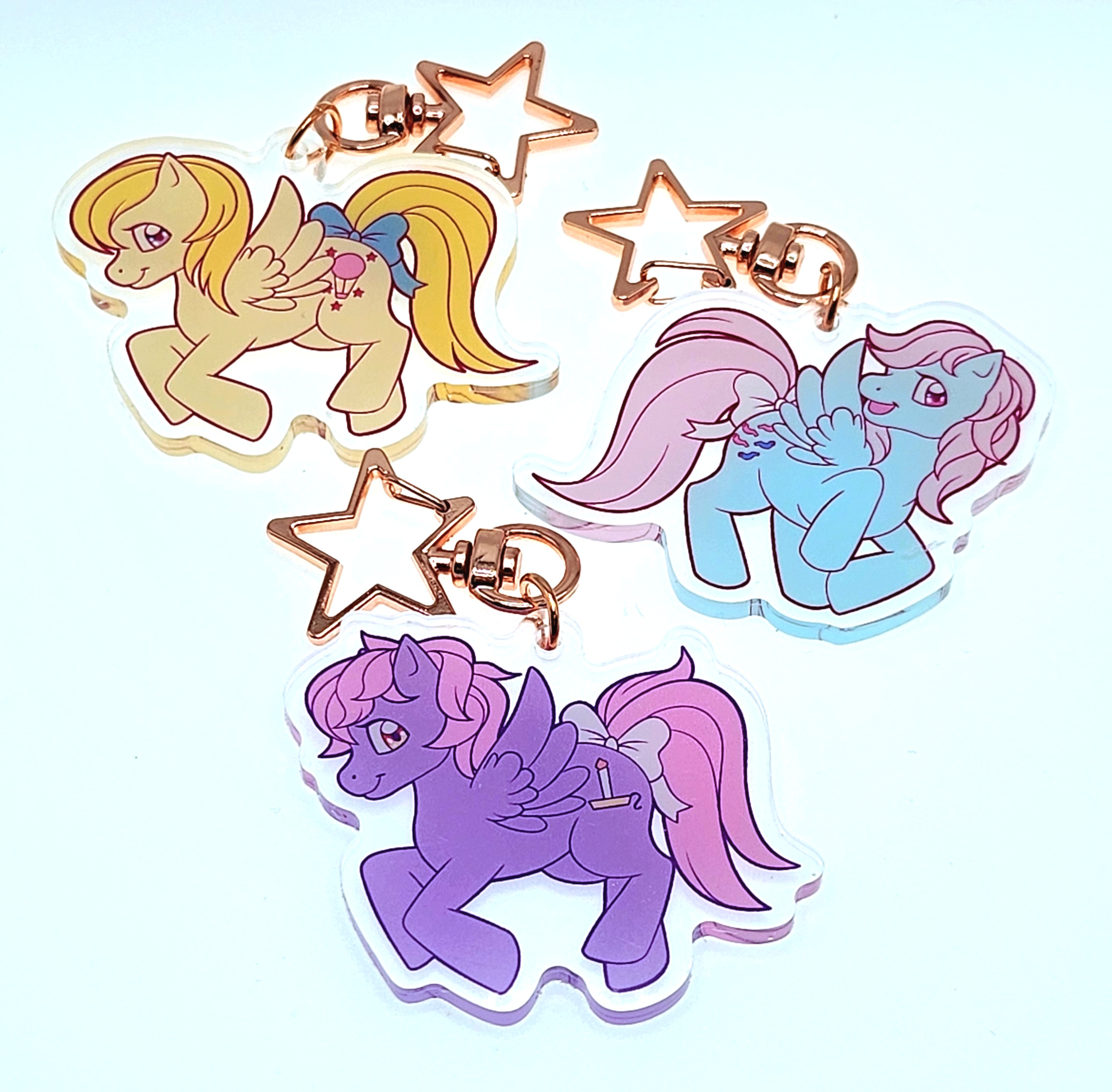 Each Paradise Pony keychain is double sided in clear acrylic and is 2 inches.